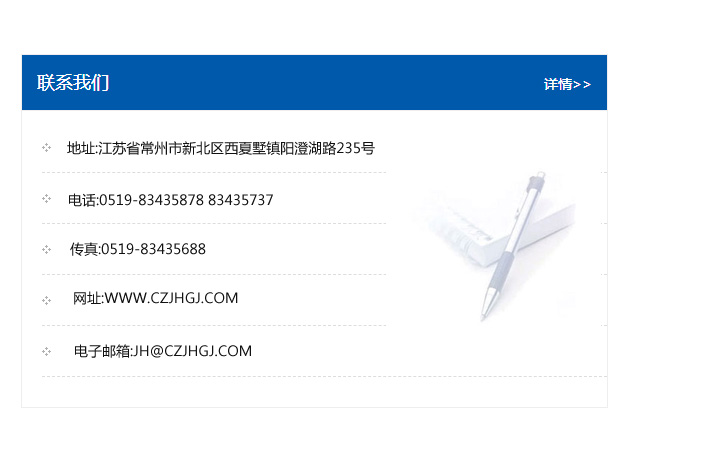 地址:常州市新北區(qū)友邦商務大廈1幢16、17層  電話:0519-85101652  傳真:0519-85112595  郵編:213022  網(wǎng)址:www.cz-jiayue_cn.zchbjh.com  郵箱:xiajifengaa@163.com